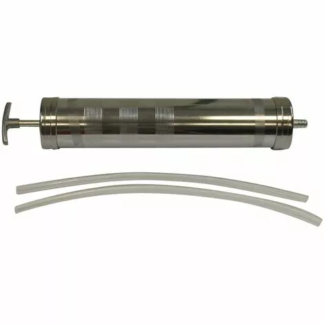 Seringue de vidange en métal avec tuyau d’aspiration.